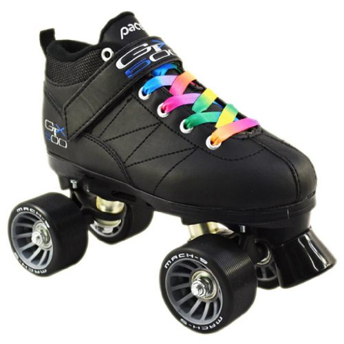 Pacer Mach-5 GTX500 Black Quad Speed Skates - Black Boots with Black Wheels & Rainbow Laces - Looking for the perfect beginner quad speed skate or an entry level roller derby skate? Look no further than the Pacer Mach-5 GTX500 speed skate! The Mach-5 GTX500 quad skate features a comfortable boot with lots of padding for long hours at the rink. The Mach-5 GTX500 speed skate has a sturdy frame on some oversized Mach-5 GTX500 wheels for the ultimate in looks and performace! These quality Mach-5 speed skates come with some solid racing bearings to keep you rolling around with ease. We've added in some custom rainbow laces to this package for a look that you can't find anywhere else! The Mach-5 GTX500 is perfect for those looking for speed skates on e budget without sacrificing quality and performance! These speed skates are in Mens sizes. Ladies please go down one size for the proper size. For example, a Mens 6 equals a Ladies 7.