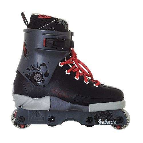 The Razors Cult Street Red Aggressive Skates is the latest model of Razor's most popular aggressive skate design. Based on successful pro models such as the Shima 2 and 3 the Street features a replaceable Razors Classic Cult Soul Frame, a new re-designed Razors liner with articulated ankle shape and excellent heel support. Also features fiberglass reinforced Razors 42mm anti-rockers with aluminum spacers. The Razors Cult Backslide Plate is replaceable and comes with a perfectly positioned groove for immediate out of the box use. It protects the boot and like all other parts of the skate can be replaced when worn out. . Lining Material: Razors Genesys, Skate Type: Aggressive, Special Features: Perfectly grooved backslide, Number of Wheels: 4, Wheel Brand: Razors, Wheel Configuration: 56mm - 42mm - 42mm - 56mm, Wheel Durometer: 90A, Bearing Type: ABEC 3, Bearing Size: 688 - Micro, Maximum Wheel Size: 56mm, Closure System: Laces and buckle, Bearing Grade: Recreational, Front Wheel Size: 56mm, Ventilation: No, Liner Type: Razors Liner, Anti-Rocker: Yes, Frame Type: Razors Classic Cult Soul Frame, Skill Range: Intermediate - Advanced, Model Year: 2012, Product ID: 245989