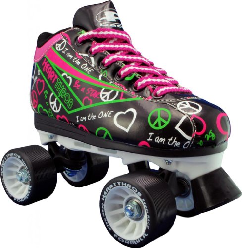Pacer Heart Throb Womens Black Quad Speed Roller Derby Skates - Get your COLOR ON! The Exciting New Heart Throb has a style all it's own with this Colorful NEW Look. A Youthful Attitude with Speed and Power at an even more Attractive Price. Get on your COLOR with Heart Throb now! - SIZING: These skates come in Ladies sizes only. Men, please select one size up from your normal shoe size for the equivalent fit. For example; A Ladies 7 equals a Men's 6. Remember, since the skates are in Ladies sizes, the ladies size you select will be shipped out to you. For example; If you select a Ladies 7/Mens 6 when placing your order, a size 7 will be shipped to you. Sizes 1-3 are Unisex Kids sizes.