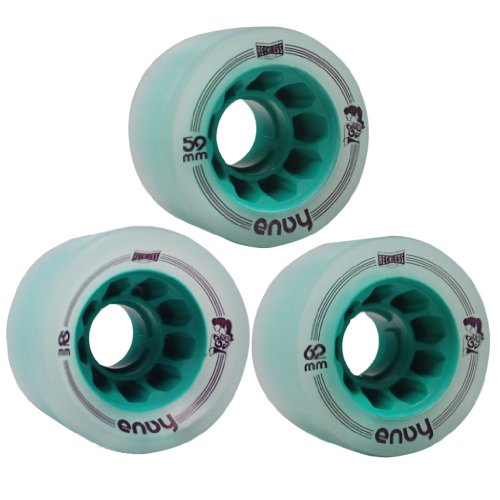Reckless Envy Hybrid Quad Roller Derby Speed Skate Wheels - Your Choice of Wheel Sizes! - The all new, RECKLESS ENVY "all purpose" hybrid skate wheel is the answer to all of your problem skating surfaces. The new Reckless Envy gives you a superior grip and roll for all kinds of surfaces, from unpolished concrete to slick wood floors and dirty sport tiles. Use Reckless Envy as pushers, or mix with the Reckless Evader and Ikon for extra traction. The Reckless Envy is a super alternative to standard outdoor wheels, providing great traction and stability on asphalt, cement, outdoor skate parks, and tennis courts. Grab your set of Reckless Envy 'all purpose' hybrid wheels and be ready for anything. Bearings and spacers sold separately. The term 'hybrid' comes from when the first wheel with an OUTDOOR urethane was coupled with a INDOOR hub. It's also used on multiple surfaces for extra grip, or as some refer to as a 'pusher' wheel. The wheels are specifically designed for slick or ruff surfaces. The grip on just about everything, but come in the same shape as a standard wheel, not super narrow like a traditional outdoor wheel.