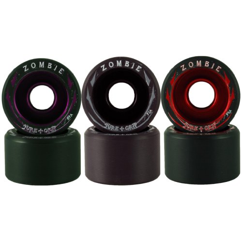 Sure Grip Zombie Quad Roller Derby Skate Wheels - Your Choice of 89A Purple, 92A Black, or 95A Red in LOW MID or MAX wheel sizes! Tired of new wheels not performing like your last set? The Zombie wheel will never have this problem. Zombie wheels feature anodized aluminum hubs for maximum durability and precise feel while maintaining rock solid stability. This allows our unique urethane compounds to deliver all your power to the floor. Choose the Zombie combination that fits your skating style and surface. Zombie Aluminum Core - Designed in house and manufactured using state of the art machining technology. What makes this different from other aluminum cores? The Zombie core is machined from a solid billet of aluminum, using the same manufacturing processes as they use to make the famous Power Trac racing plates. This increases strength and allows us to machine the hub to a tighter tolerance than any other hub on the market. Creating the perfect fit between bearing and inner core. Cores are then treated with a special anodizing process to increase hub durability and urethane bonding. This technology is unique to the Zombie wheel line. Zombie Insane Urethane - Specially formulated to our exact specifications that were developed from 75 years in the skate wheel business. What makes this wheel different from the rest? All wheels are poured using a precise time schedule to ensue product quality throughout the range. Typically wheels are poured over time, sometimes days. This can change the characteristic of a wheel poured one day vs. another or even morning vs. afternoon. This timing is what make the Zombie wheel the most unique wheel on the market.