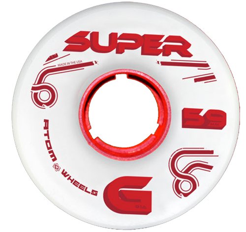 Atom Super G Wheels - Atom Super G Red Wheels - 91A Derby Skate Wheels - MIND BOGGLING is how we'd explain this wheel. Super G features a full urethane front supported with a large back mini-core. We've never used this mini core before but it proved its worth in testing. Looking for something that has more grip than a Stinger but not as soft as a Poison?, this is your wheel! - Perfect for: Wood, Sport Court, Polished Concrete