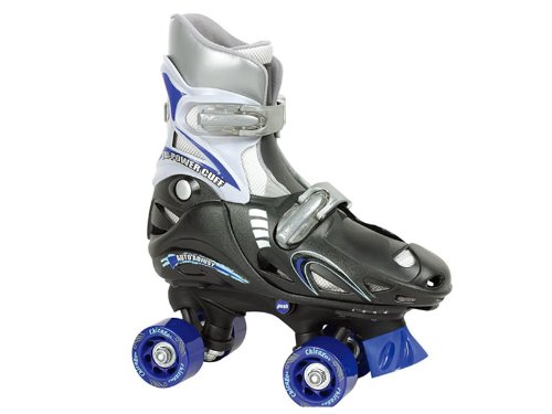 Chicago 205 Cruiser Skates - Boys Adjustable Quad Roller Skates Kids - These sharp-looking quad skates for boys are designed to adjust through four full sizes, which means they'll grow with your child as he learns to skate, and you can actually get your money's worth. Constructed of durable vinyl, the skate features a micro-ratchet buckle closure, an easy-to-use system that provides a snug, comfortable, custom fit. Oversized composition wheels and semi precision bearings keep him rolling smoothly and in control, while the built-in toe brakes give him safe and reliable stopping power. The skate comes in black and grey, with blue wheels.