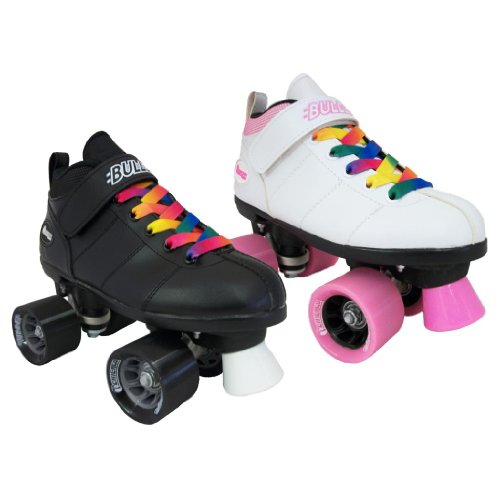 Chicago Bullet Quad Speed Skates with Rainbow Laces - Your Choice of Boot Colors - This speed skate from Chicago is designed for racing but is also a popular choice for all-around rink and social skating. Made of durable vinyl, the skate's comfortable, low-cut boot allows for freer movement of the ankle as you turn corners and maneuver around obstacles. The wide 62-mm, urethane wheels with precision bearings and fixed axles provide stability and control, while the front toe breaks offer safe and reliable stopping power. The lace closure system is easy to use and allows you to make the proper adjustments while skating. Black skates are in Mens sizes; White skates are in Ladies sizes.