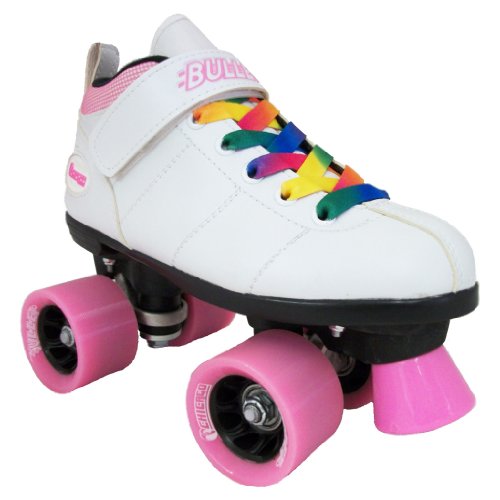 Chicago Rainbow Bullet White Speed Skates - Chicago Quad Roller Skate - This speed skate from Chicago is designed for racing but is also a popular choice for all-around rink and social skating. Made of durable vinyl, the skate's comfortable, low-cut boot allows for freer movement of the ankle as you turn corners and maneuver around obstacles. The wide 62-mm, urethane wheels with precision bearings and fixed axles provide stability and control, while the front toe breaks offer safe and reliable stopping power. The lace closure system is easy to use and allows you to make the proper adjustments while skating. White Skates are in Ladies Sizes.