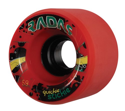 Radar Quickie Stickie Red Skate Wheels 93A Hardness and Size 59mm x 42mm Roller Derby Speed Skating Replacement Wheels by Riedell - Skaters challenged us to make a grippy wheel with lots of roll. We started by creating a brand new core with less material than ever, making it light and flexible. We added our finest urethane tire formula and shaped it shorter than normal. The result is a wheel with lots of roll and plenty of flex in the hub, allowing for a smooth, grippy feel. Available in 3 hardnesses. Note the added flex causes the graphics to wear off quicker than usual.