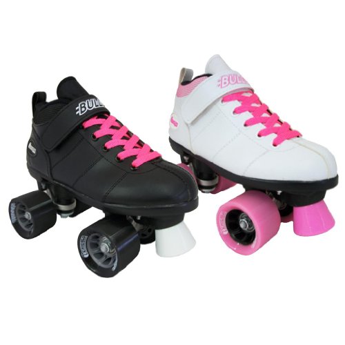Chicago Bullet Quad Speed Skates with Pink Laces - Your Choice of Boot Colors - This speed skate from Chicago is designed for racing but is also a popular choice for all-around rink and social skating. Made of durable vinyl, the skate's comfortable, low-cut boot allows for freer movement of the ankle as you turn corners and maneuver around obstacles. The wide 62-mm, urethane wheels with precision bearings and fixed axles provide stability and control, while the front toe breaks offer safe and reliable stopping power. The lace closure system is easy to use and allows you to make the proper adjustments while skating. Black skates are in Mens sizes; White skates are in Ladies sizes.