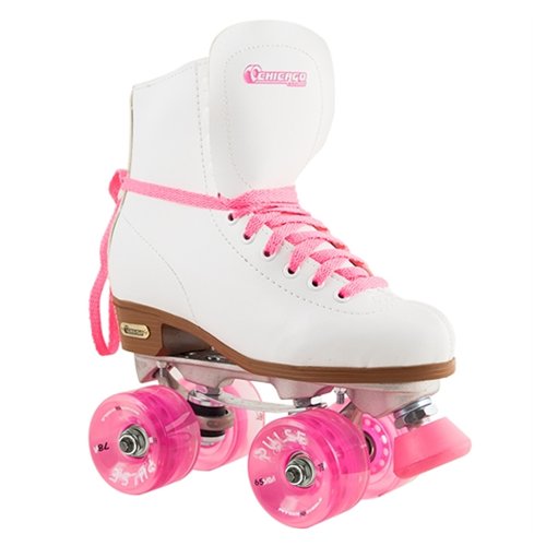 Chicago 400 Starter Ladies Classic Rink Skate with Atom Pulse Pink 78A Outdoor Wheels - These skates are very comfortable and offer plenty of ankle support. They come with the popular Atom Pulse outdoor wheels for a smooth ride on any outdoor surfaces. - SIZING: These skates come in Womens sizes and run true to your normal shoe size.