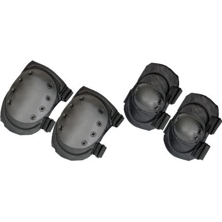 Humvee Gear - Black Knee/Elbow Pads. Model: HMVKEPB. Black 600D polyester with PVC coating, composite anti-skid inner lining and thick foam inside. Durable in all weather conditions. One size fits all with adjustable velcro straps. Large coverage area. Dependable shock resistant rivets. Includes one set of elbow pads and one set of knee pads. Packaged in reuseable mesh bag with drawstring. Color: Black.