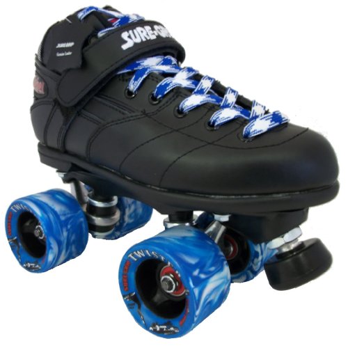 Sure Grip Rebel Twister Speed Skates - Black Leather Boots with Blue and White Swirl Twister Wheels and Plaid Laces - Style meets speed with the Sure-Grip Rebel Speed Roller Skates! Perfect for speed skating and roller derby, these leather boot skates with a comfortable microfiber lining and snug cinch strap are your ticket to the finish line.
