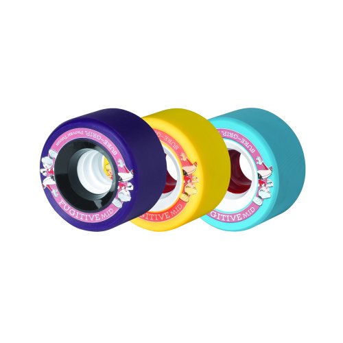 Fugitive Mid Quad Roller Derby Speed Skate Wheels by Sure Grip - Your Choice of Wheel Colors/Hardnesses - Poly BD urethane around a hybrid core. Similar core design to the fugitive but we added more strength to the outside of the wheel. Doing so will help the wheel stay firm and more upright during skating. This is important because wheel lip flex is important for speed skating but some skaters require a firmer wheel for quick movements sided to side, similar to the type of skating a blocker does. 62mm x 35mm