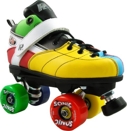 Sure Grip Rock GT50 Explosion Sonic Outdooor Speed Skates - Multicolor Boots with Rainbow Sonic Outdoor Wheels - Sure Grip Rock Explosion - Multi-Color Wheels - These skates are EXPLODING on to the scene with a color pattern you've never seen before. If you've got the Passion for Flashin' then strap these new Sure Grips on your feet and make some heads turn at the rink.Built from the new Rock Expression with a unique boot featuring various color layouts, this boot is sure to be a eye catcher on the track. Rock boots feature comfort fit deluxe synthetic leather upper with a cinch strap and cushioned contour insoles. - Speed Skates come in Men's Sizes - Ladies : Go down one size (Example: Ladies 8 = Men's 7) - Below Size 4 are Unisex Kids