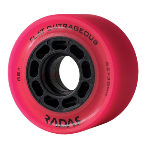 Radar Flat Outrageous Pink Skate Wheels 8-Pack 88A Hardness and Size 62mm x 37mm Roller Derby Speed Skating Replacement Wheels by Riedell - The Flat Outrageous features the same grippy 88A urethane formula as the Flat Out, but in a narrow width, for added maneuverability and less wheel clipping. The Flat Outrageous is the most affordable derby wheel available.