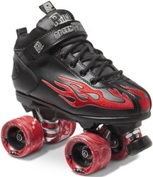 The Rock Flame Speed Skate ,offers deluxe synthetic leather uppers. Cambrelle lining,comfort padded ,collar,cushioned contour insole. Rock nylon plates and trucks,Sure Grip Twister wheels,62mm x 40mm 96A ,Hardness. Colors white w/ Red,White w/ Green,White w/ Purple,Yellow w/Red,,White w/Blue,White w/Black,White w/Pink,White w/Yellow. Mix any color ,combination for that custom look. Rock ABEC 5 bearings and mini round ,adjustable toe stops. Men?s Sizes 1-13 ladies drop back one size for the ,perfect fit.