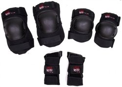 Triple 8 lil Tricky Tri Pack Protection Gear Includes wrist ,guards,knee pads and elbow pads,Light weight,shock absorbing,ventilated EVA ,foam provides cool air flow and limits perspiration. Ergonomically designed for ,comfort. Wide,reinforced elastic straps ensure a secure fit. Ideal for skateboarding,biking,inline ,skating (roller blading),and all roller sports. ,,One size fits all - ,Youth ages 6-11 ,,Free Instructional DVD Action packed skate scenes starring ,Mitchie ??Little Tricky? Brusco Mitchie ??Little Tricky? Brusco informational ,safety segment including section on how to fit protective gear.