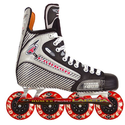 Tour Code Carbon Senior Inline Hockey SkatesCode Carbon Boot: The next generation of Code technologyOur custom graphite carbon composition mirrored with nylon fibers results in weight reduction/added strengthGraphite reinforced quilted DRI-VECC liningMemory cushion footbedLabeda Hum'er Proset frameLabeda Fuzion mini-core wheelsBevo ABEC 9 mini bearings