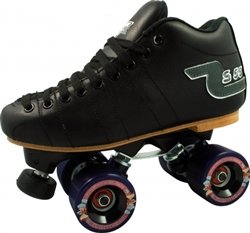 The Sure Grip S55 Invader Fugitive Roller Derby Skates ,features the new Sure Grip S55 boot top grain leather uppers,comfort padded ,lining,full leather outsole,and cushioned contour insole. The Sure Grip ,Invader plates with DA45 trucks. Sure Grip Fugitive MID quad skate wheels a ,narrow version of the original derby wheel "The Fugitive." Purple ,(grippiest) 87A,Blue (grippy) 90A,Yellow (med grip) 93A Green (fast) 96A. Qube Juice bearings and ,adjustable mini Webb toe stop. Available in black size 4-14. Ladies please drop ,back one size for the perfect fit.