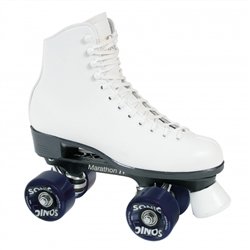 The Sonic Top Hop Outdoor ,Roller Skate feature a Dominion Patriot boot.Full leather lined uppers,reinforced padded ankle for support and nylon ,reinforced Marathon plates. Sonic wheels come in a variety of colors. Black,Blue,Green,Red,Pink,or Yellow. Mix ,and match for more fun. They have a super ,high rebound,long lasting urethane,nylon core for perfect bearing alignment. ,Super smooth roll. 85A hardness 62mm X 32mm size and Sonic abec 3 bearings. Non ,adjustable toe stop. Sizes 3-10 white ,3-13 black.